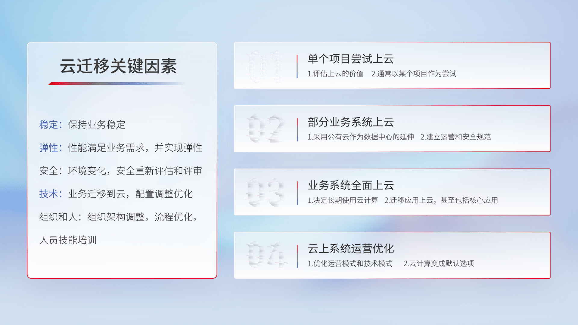 结合实际业务,,,从规划设计、、、、云平台选型、、、、云原生改造、、数据迁移、、、、集成交付,,迁移全过程为客户识别最佳上云路径,,,做好风险识别管理,,,,设计网络架构、、、、身份权限、、、安全审计合规、、操作审计、、、、日志审计、、、监控告警策略、、多站点容灾设计等,,,对云上基础设施进行整体规划,,提升IT治理水平,,,,以满足弹性、、、高可用、、高性能的需求。。